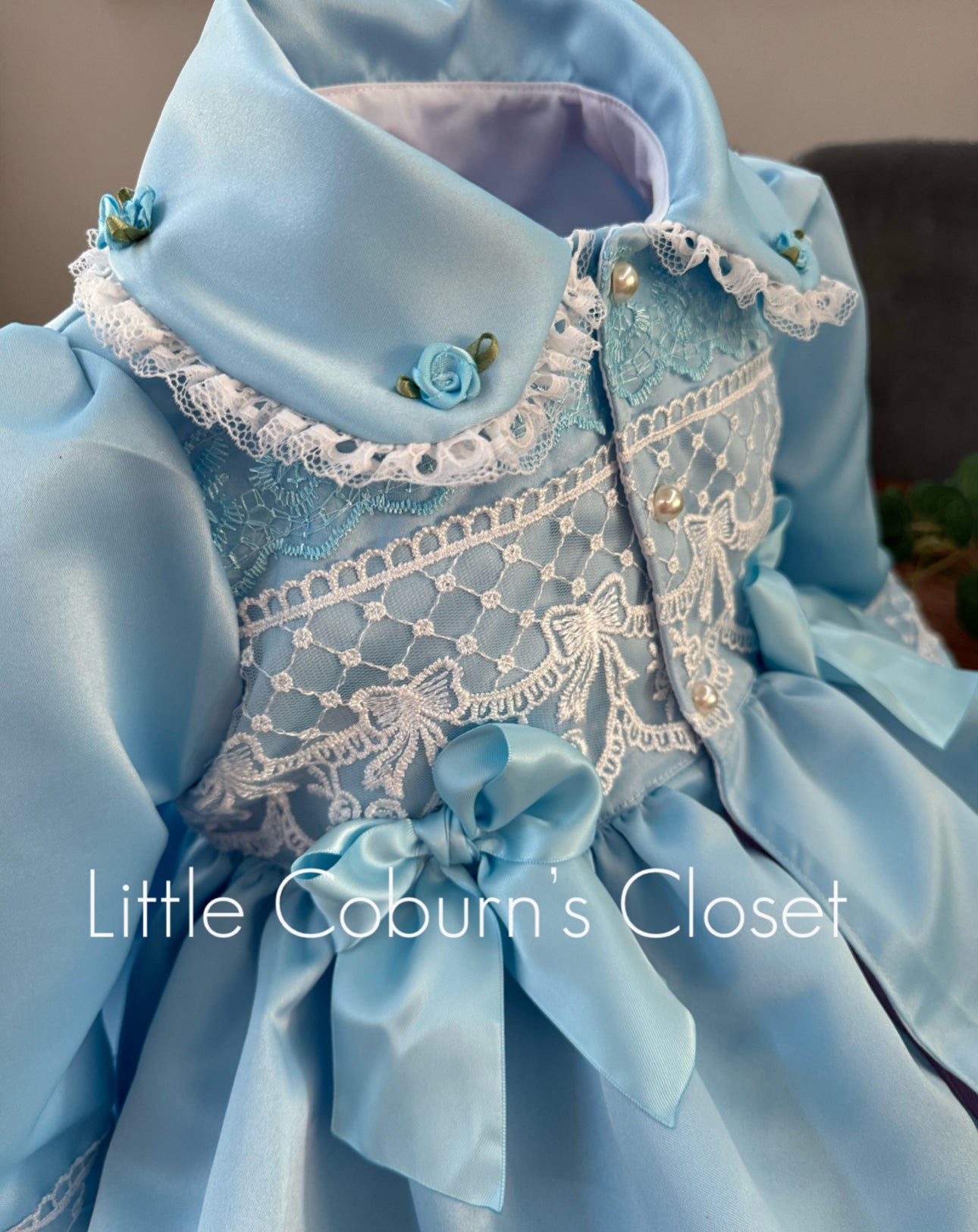 Beautiful Blue La Rose Coat with the most beautiful lace details and tiny rose buds.