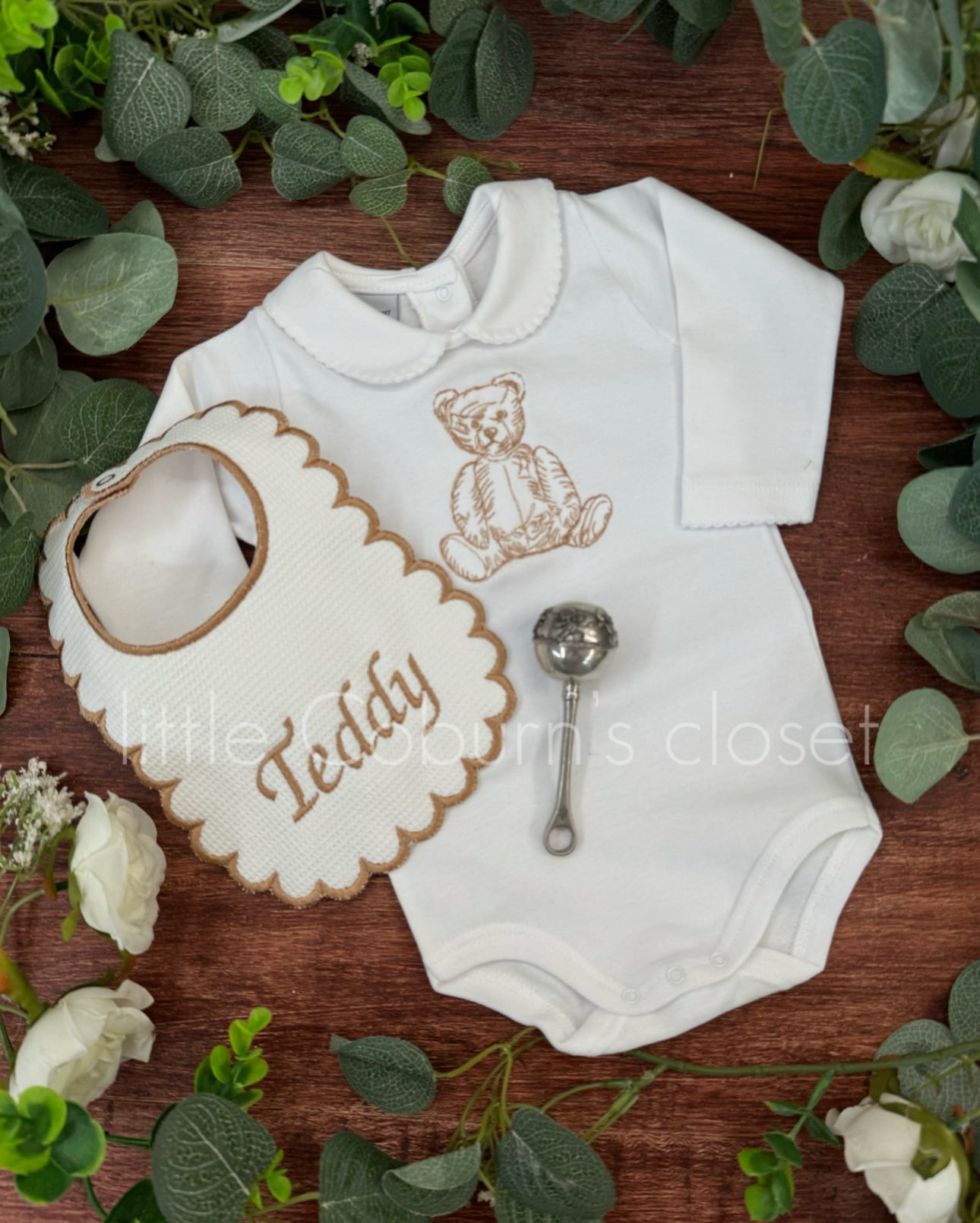 Beautifully embroidered Teddy Spanish vest and personalised embroidered bibset.