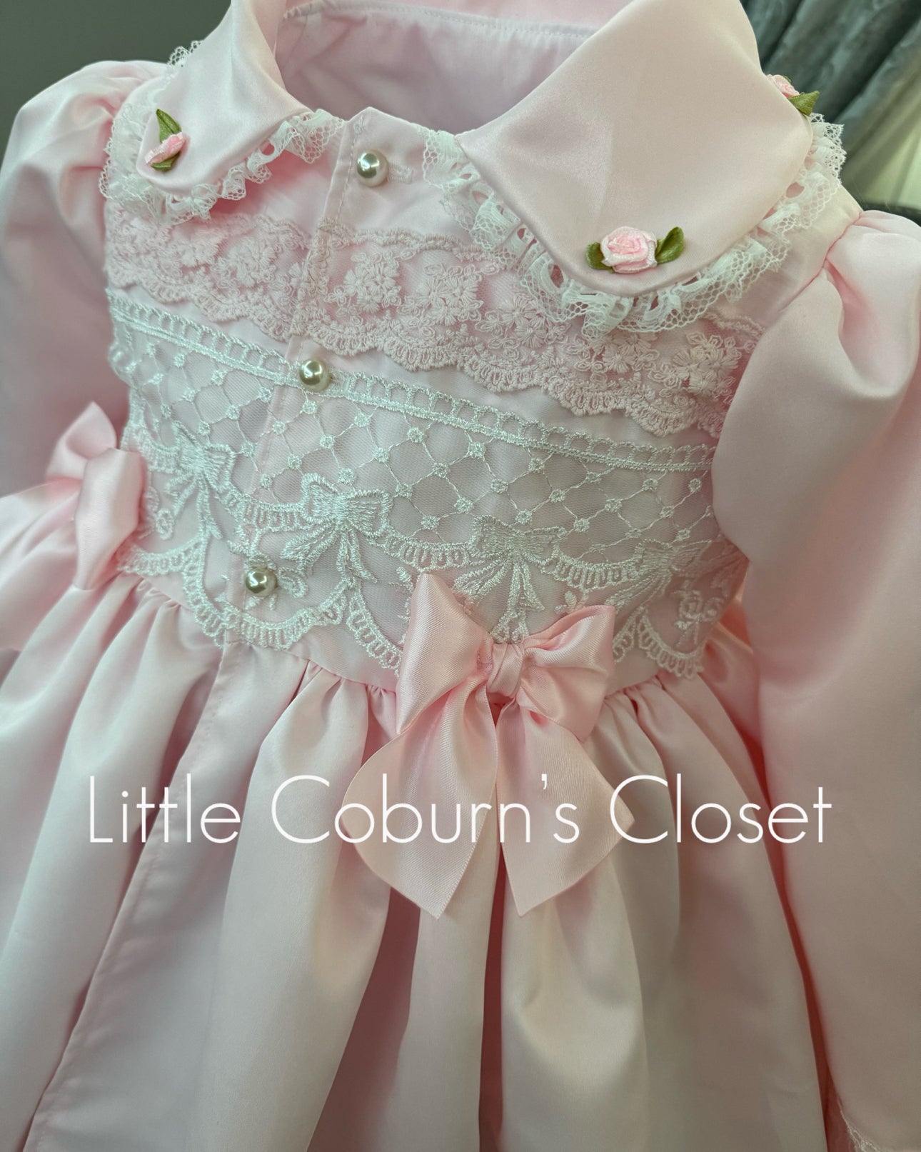 Beautiful pink La Rose Coat with the most beautiful lace details and tiny rose buds.