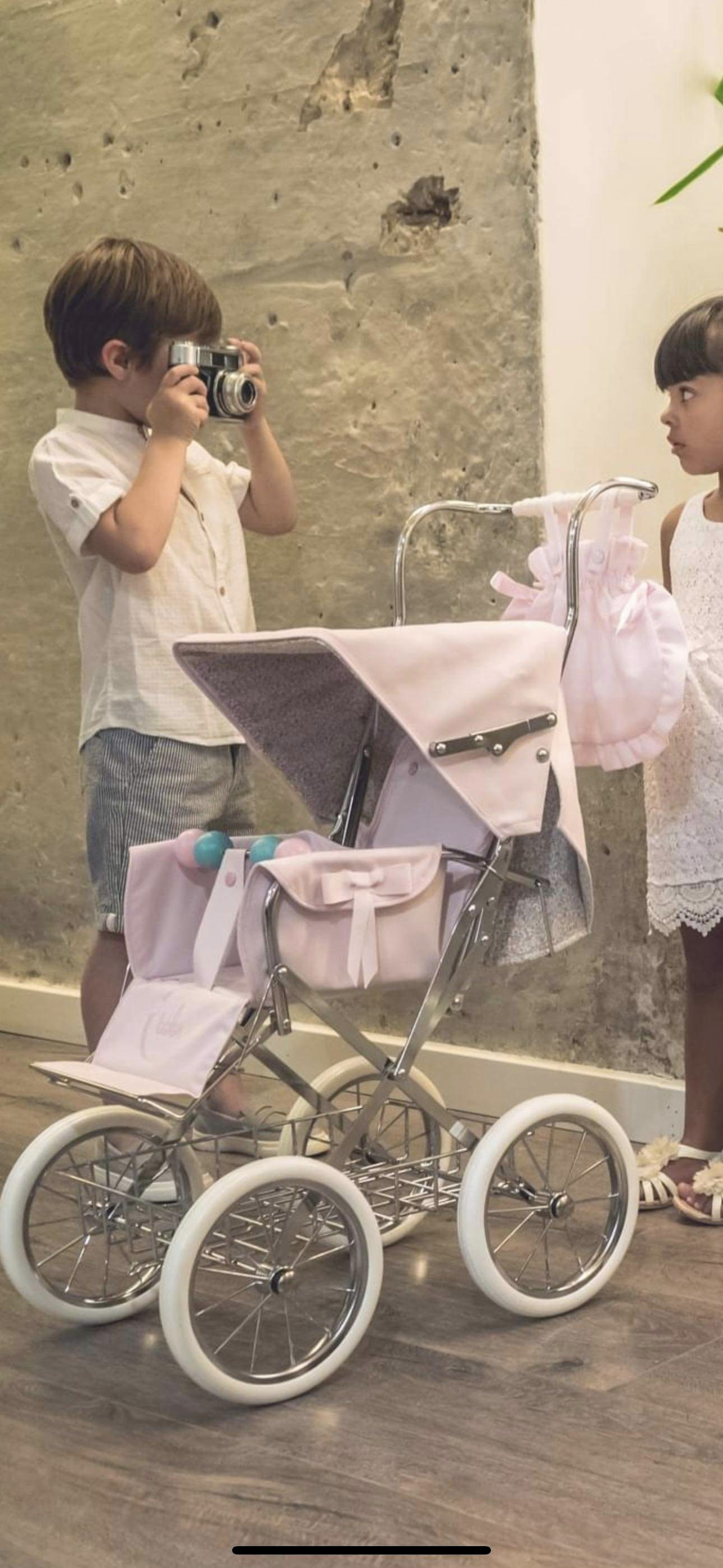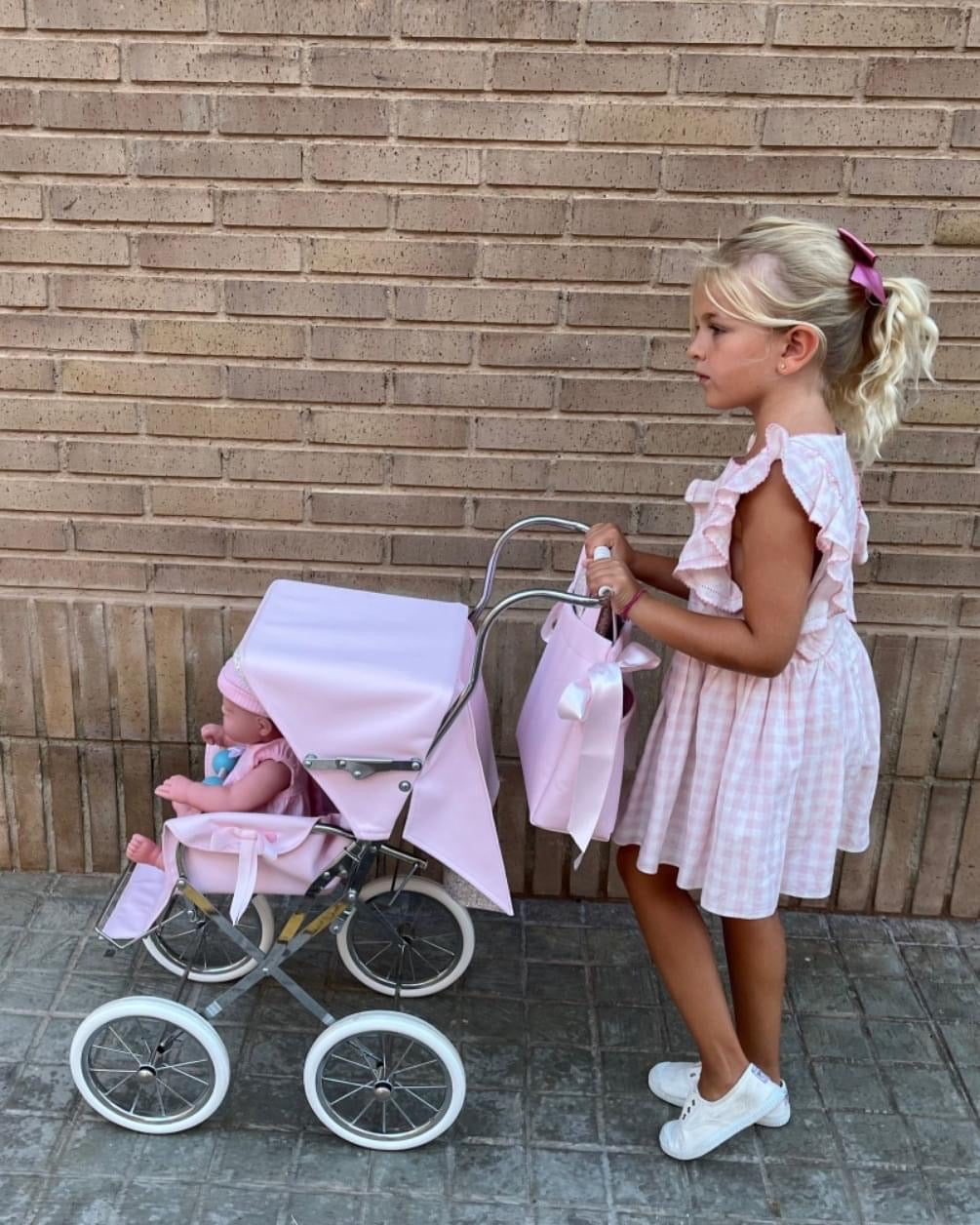 Baby pink napa leather and lining handmade pushchair.